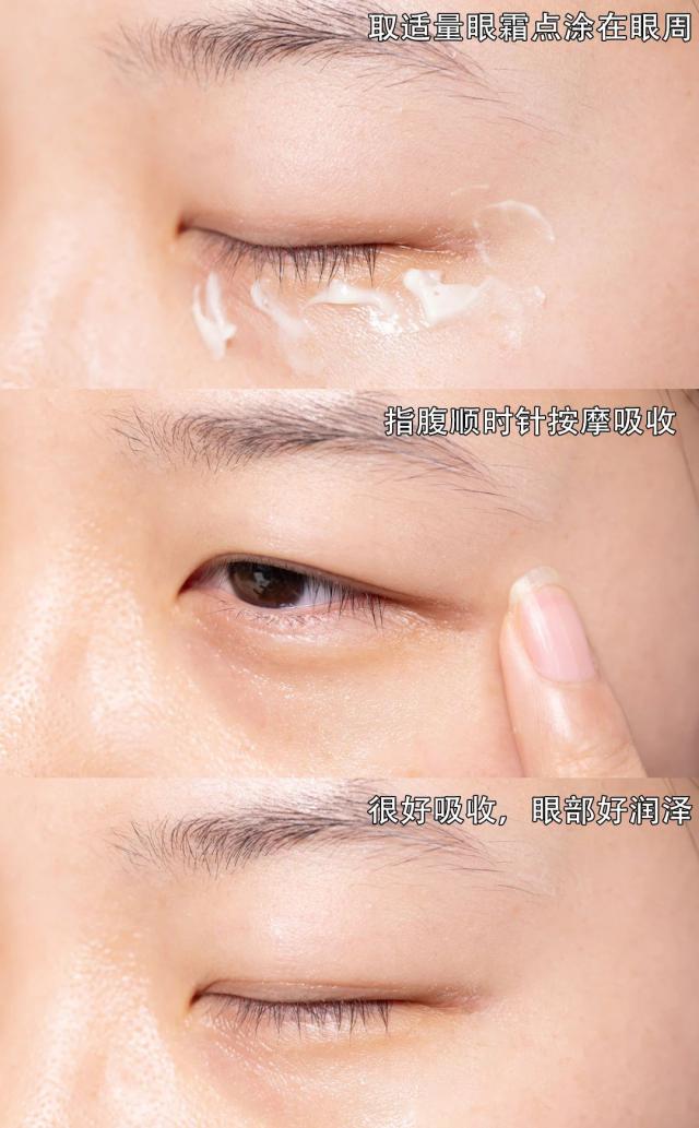 建议少量多餐上眼叠加,用指腹轻轻打圈按摩,不能来回拉扯皮肤。