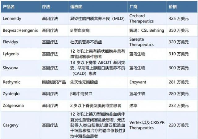根据 Globaldata 数据显示,在被称为“创新药物天堂”的美国市场,截至 2024 年 8 月前十名中最昂贵的药物有 9 基因疗法药物都是基因疗法药物,其中世界上最昂贵的基因疗法药物 2024 年获 FDA 早发性异染性脑白质营养不良可治疗。 Lenmeldy,其由 Orchard Therapeutics 开发,是一种一次性基因治疗药物,价格达到 425 万美金 / 剂。
