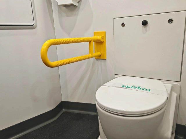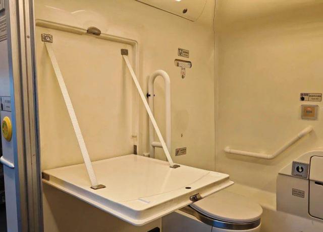 无障碍卫生间配有扶手,方便重点乘客使用。