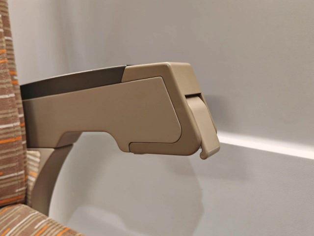 如果需要调整椅背的角度,可以找到扶手上的按钮,拉动或按压后可以根据需要调整视角。在调整座椅靠背之前,请观察杯子等物品是否放在后面的小桌子上。