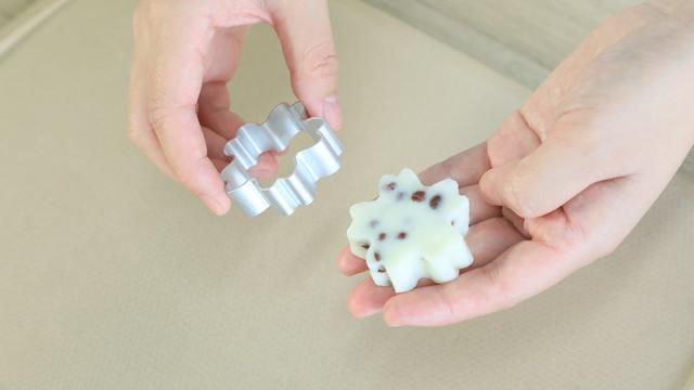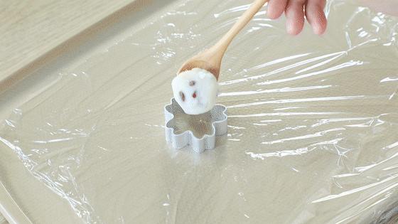 将一勺山药红豆泥放入模具中,抹平表面。
