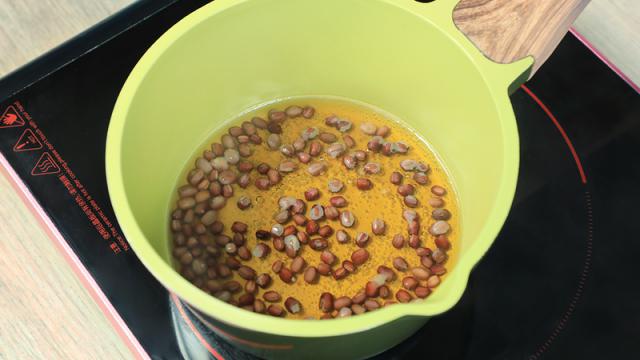 将浸泡过的红豆放入锅中,倒入锅中 60 克清水,