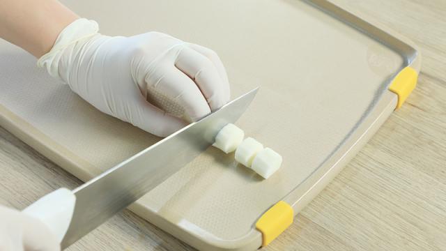 撕掉一个保鲜袋铺在菜板上,