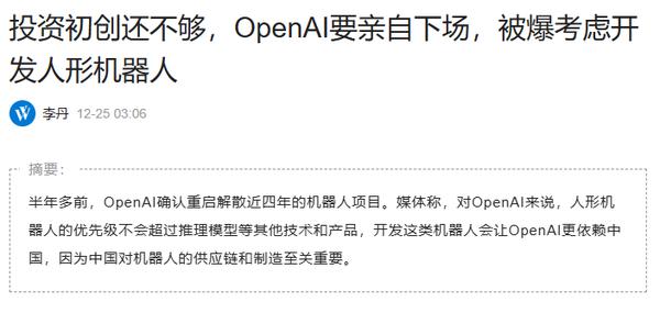 但是,人形机器人的开发也会给予。 OpenAI 这带来了一些挑战。根据报道,如果中国对机器人的供应链和制造尤为重要, OpenAI 真正开发人形机器人,那么它可能需要更多地依赖于中国的供应链和制造能力。毫无疑问,这将给予它。 OpenAI 给供应链管理带来了新的考验。