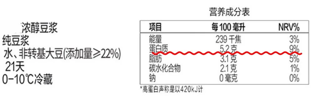 豆浆中的蛋白质相当于牛奶,容易消化吸收。根据中国食品成分表第一 6 根据版本数据,牛奶和豆浆的蛋白质含量是多少? 3.3 克/100 克、3.0 克/100 克,这两个数字都是平均的,真的买豆浆,你看蛋白质含量高很多,比如下图。