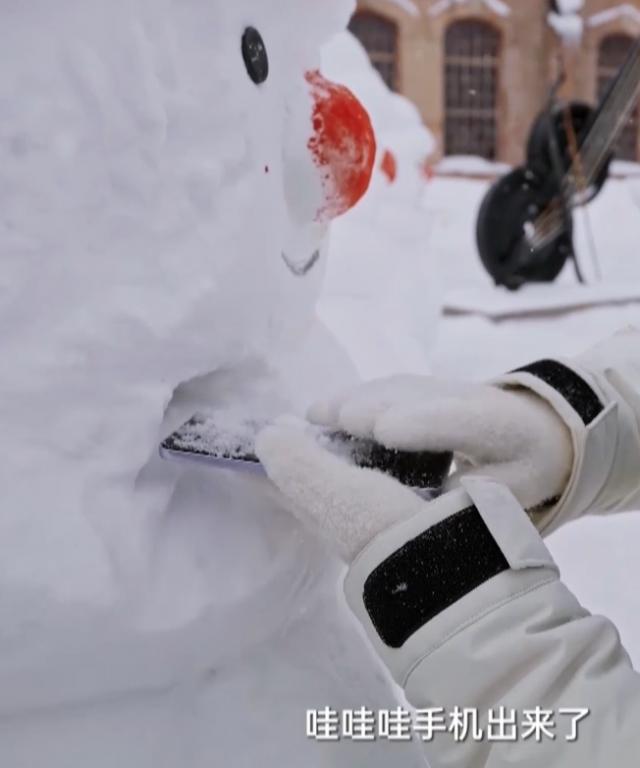 因此他们把 A5 Pro 把冰雪带到室外,把手机塞进雪人里面。