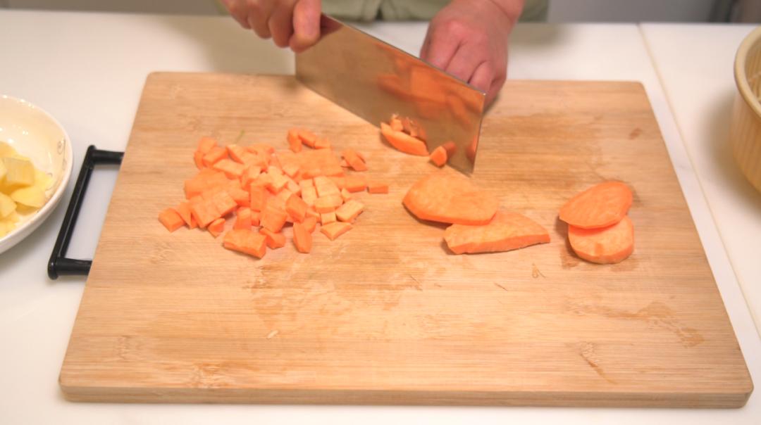 将红薯和苹果洗净去皮,然后切成丁。