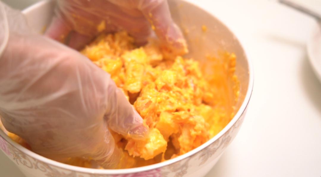 5. 在锅里刷油,起火,把搅拌好的红薯苹果放进锅里。