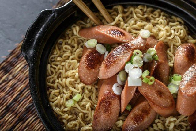 方便面和香肠都是高盐高钠的食物,一起吃,咸咸的,不利于血压控制,进而影响血糖。此外,方便面通常在低温下油炸,即使不浸泡在水中也可以食用。糊化速度快,血糖升高率高,不利于餐后血糖控制。
