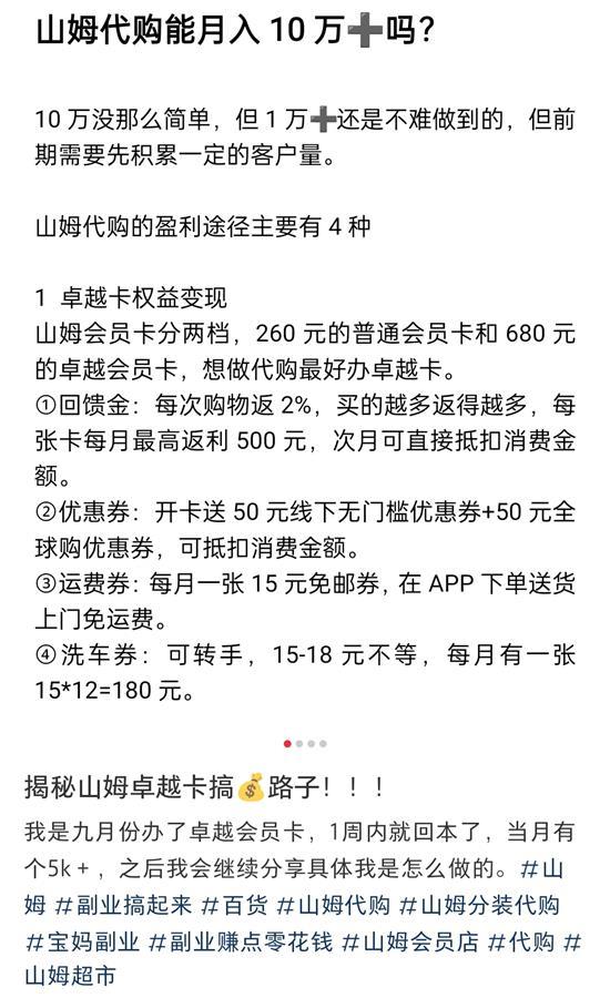 如何完成采购,采购如何盈利?记者在社交平台上搜索,看到很多山姆采购分享了自己的采购经验,说可以通过各种方式盈利,比如直接按件收取采购费;申请优秀会员卡,消费返利2%。办理多张会员卡,效益更高;购买9.7折购物卡赚取差价。记者试图私下谈谈山姆采购的几个细节,但没有得到回复。