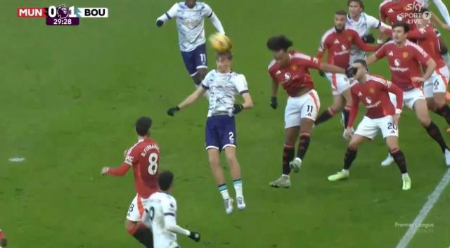 当瑞恩 · 当克里斯蒂给伯恩茅斯右路任意球时,曼联中锋齐尔克泽在同一个地方跳了起来,只顶到了气体上,因为伯恩茅斯年轻的中卫迪恩,他应该盯着他。 · 胡伊森早已向前跑去,甩头将球顶进安德烈。 · 奥纳纳守卫曼联的球门。