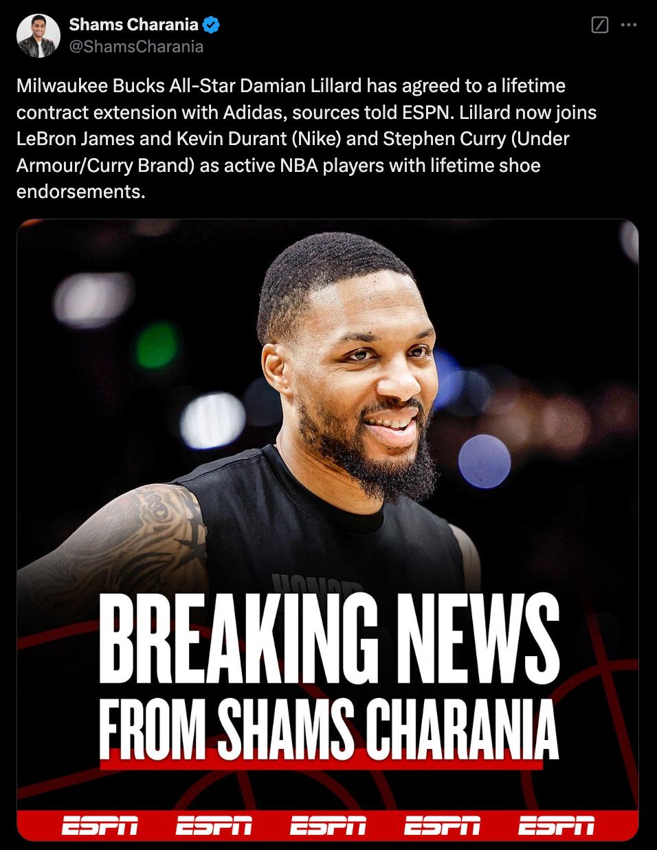 据著名记者Shams报道,雄鹿在获得NBA季中锦标赛之后:在詹姆斯(耐克)之后,利拉德与阿迪达斯签订了终身合同,成为继詹姆斯(耐克)、在杜兰特(耐克)和库里(安德玛)之后,第四名NBA现役球员与运动品牌签订了终身代言合同。