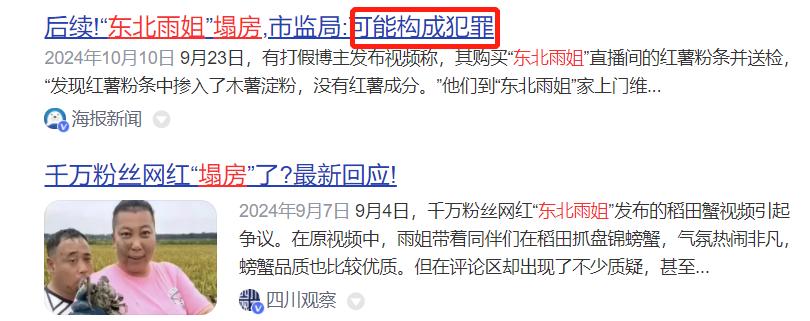 9月24日,一位博主爆料称,他购买了数百万粉丝“东北雨姐”出售的红薯粉丝。检查后发现没有红薯成分。产品中加入了木薯淀粉,团队上门寻找“东北雨姐”。打假被围攻,限制人身自由。。