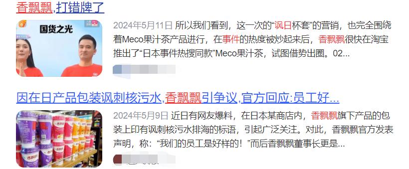 同样发生在5月份,一些网民展示了香飘飘的MECO果汁茶在日本北京和商店的商品上印有讽刺核污水排放海洋的标语。这一举动点燃了中国人在互联网上的爱国热情。