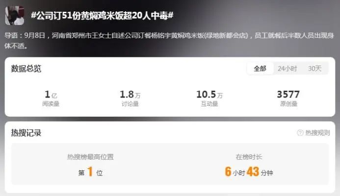今年9月,河南省郑州市王女士告诉公司,她订购了51份红烧鸡饭,其中20多人食物中毒,其中6人住院治疗。涉及的店铺是红烧鸡快餐的头部品牌杨铭宇。9月9日,该事件的话题在微博热搜榜上排名第一。