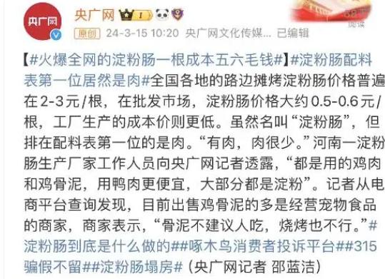 今年3月15日,中央广播网报道,淀粉香肠配料表第一名是肉,“肉多但很少”。一些制造商向中央广播网记者透露:“所有使用的鸡肉和鸡骨泥大多是淀粉”。一些电商平台商家甚至直言:“骨泥不推荐人吃,烤串也不行”。