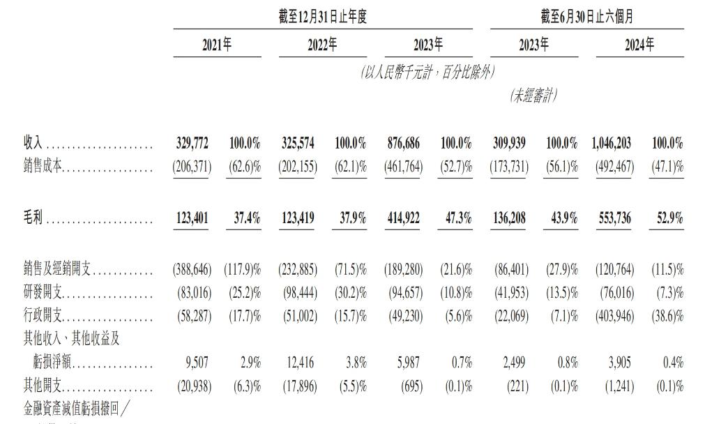 盈利状况,在 2021 年、2022 年、2023 年以及截至 2023 年及 2024 年 6 月 30 日止六个月期间,各自取得人民币 5.06 亿元、4.22 亿元、2.07 亿元、2.02 亿元及 2.54 亏损1亿元。但是经过年度调整 / 期间盈利 /(亏损)(非国际财务报告标准)指标有所改善,2021年 年及 2022 每年分别取得调整年度亏损(非国际财务报告标准)人民币 3.55亿元及 2.25亿元,并于 2023 年度成功转为调整年度利润(非国际财务报告准则计量)人民币 72.9 百万元,截至 2024 年 6 月 30 经调整期间盈利(非国际财务报告准则计量)人民币也实现了日止六个月。 2.92 1亿元的主要原因是业务增长带来了规模经济效益,使得角色玩具销售的收入奉献和毛利率强劲增长。与此同时,各种运营费用占总收入的百分比逐渐下降。