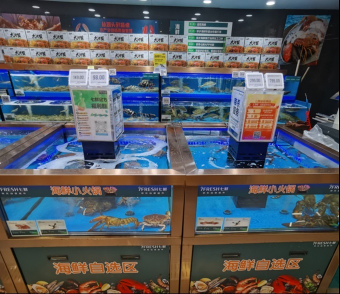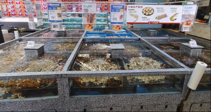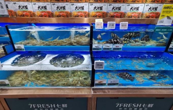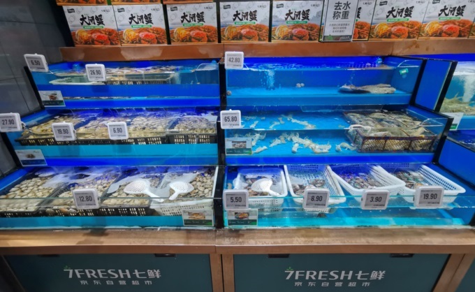 如果拿盒马北京东大桥店和七鲜店比较,可能不公平。所以这次我们主要比较一下JD.COM七鲜天津乐宾百货和盒马鲜生北京西直店。