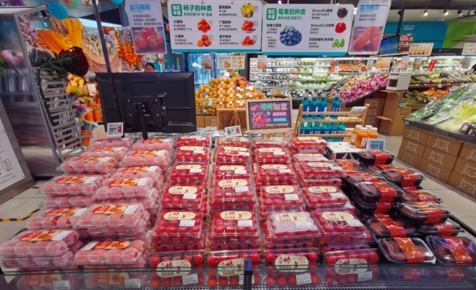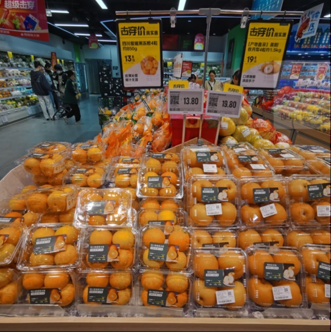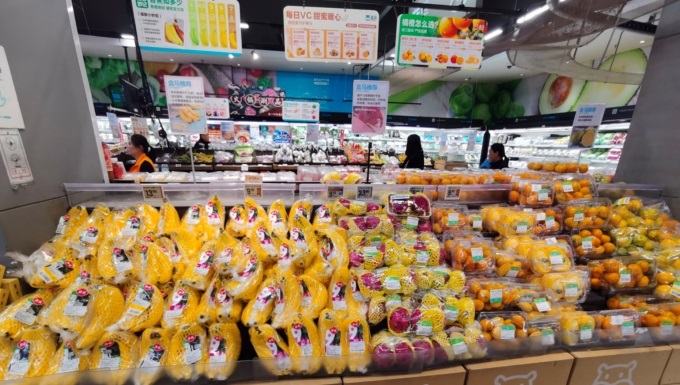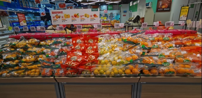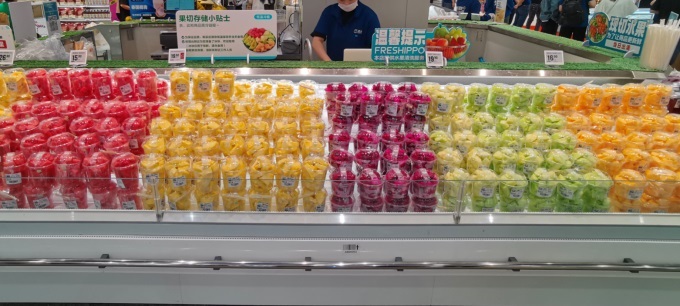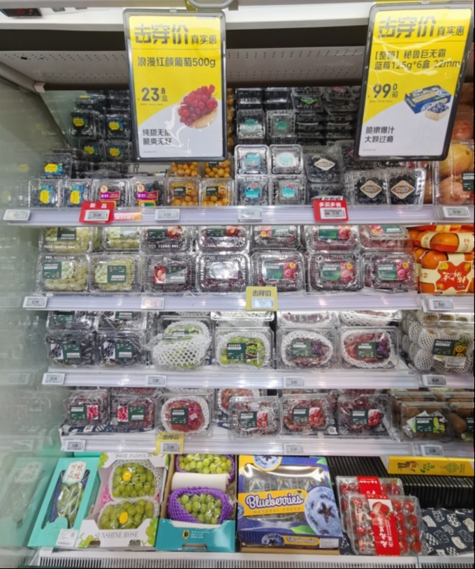 评价:通过对比,我们发现JD.COM七鲜主要经营苹果、梨、橙、香蕉等常规水果;另一方面,盒马鲜生侧重于经营多样化、明显的标志性小水果和季节性浆果,同时兼顾常规的基础水果管理。此外,两者都非常重视鲜切果切的操作,并进行了重点放大和展示。因此,盒马鲜生水果的丰富性和差异明显优于JD.COM七鲜。