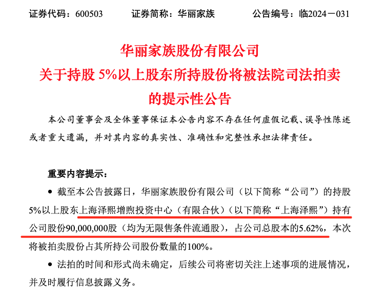 华丽家族(600503)宣布,公司近日收到青岛市中级人民法院发布的《执行裁定书》,青岛市中级人民法院将竞拍上海泽熙增暖投资中心持有的公司9000万股,占其持有华丽家族的100%,占公司总股本的5.62%。
