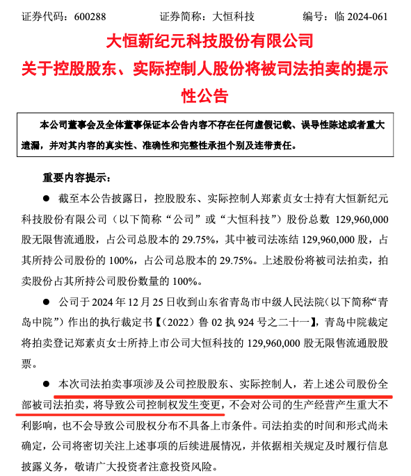根据大恒科技的公告,青岛市中级人民法院裁定,将对郑素贞持有的1.2996亿股上市公司大恒科技股份进行无限销售。上述拍卖股份占其持有公司股份的100%。占上市公司总股本的29.75%。