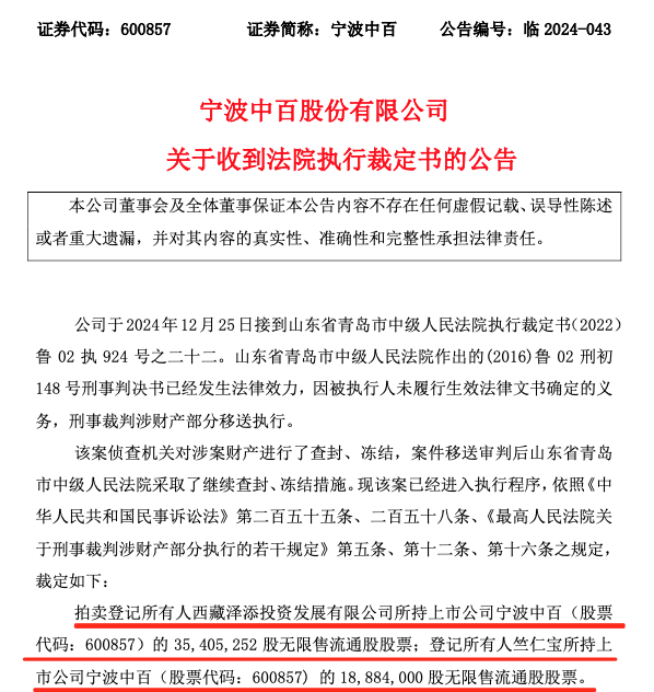 12月25日晚,宁波中百(600857)宣布,该公司于2024年12月25日收到山东省青岛市中级人民法院的执行裁决书。由于被执行人未能履行生效法律文书确定的责任,山东省青岛市中级人民法院作出的(2016)鲁02刑初148号刑事判决书已经发生法律效力,刑事裁判涉及的部分资产被移送执行。