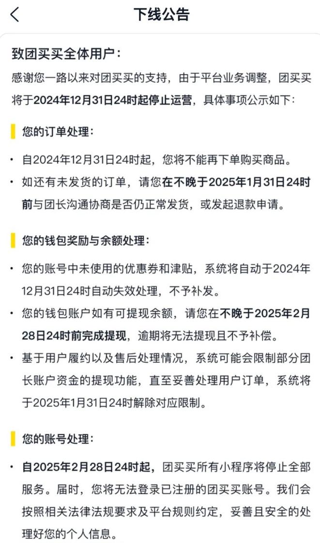 由于平台业务的调整,美团旗下微信社区团购业务团购发布公告称,2024年12月31日24时起将停止运营。
