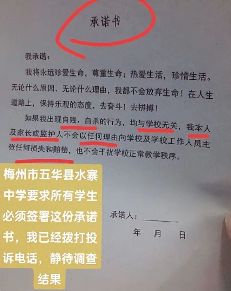 12月25日,有网友通过社交平台表示,广东省梅州市五华县水寨中学要求所有学生签署“保证书”。承诺书中提到:“如果我自残自杀,与学校无关,我自己、我的父母或监护人不会以任何理由向学校和学校的工作人员索赔任何损失或赔偿,也不会影响学校的正常教学秩序”。
