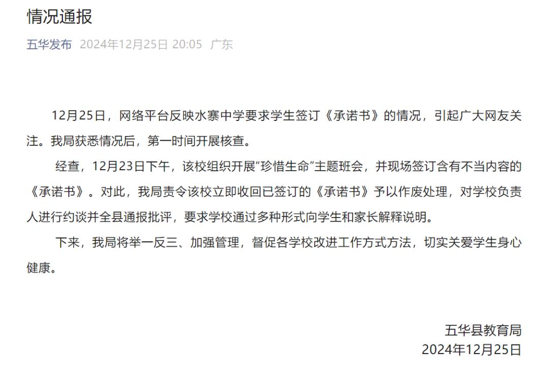 今晚,五华县教育局通报,12月25日,网络平台反映了水寨中学要求学生签署《承诺书》的情况,引起了众多网友的关注。得知情况后,该局立即进行了审查。