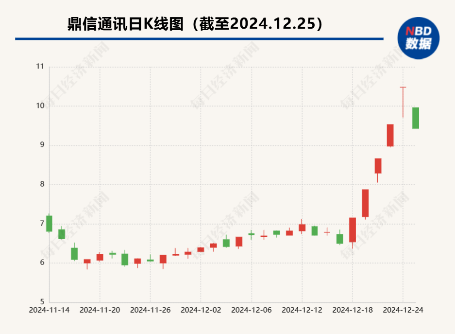 十二月二十五日9时30分,鼎信通讯开盘后直线跌停,收盘9.43元/股。鼎信通讯在25日跌停前继续获得5个涨停。