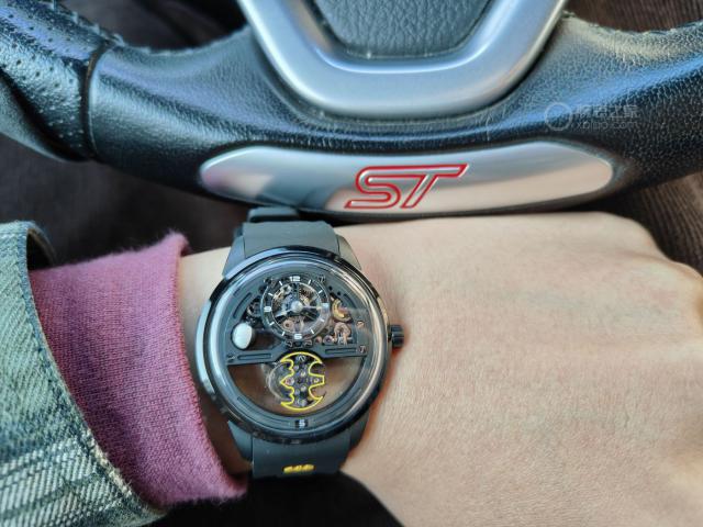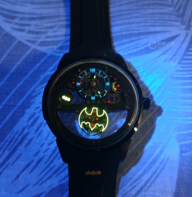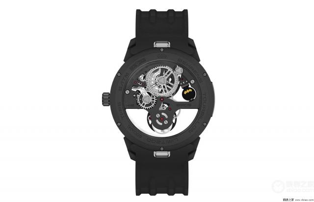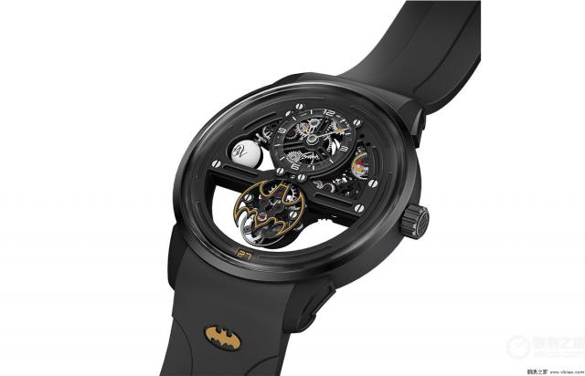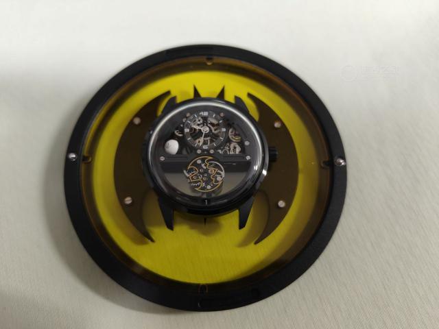 万希泉是一个专注于陀飞轮的品牌,他们过去的联名作品,ip 所有元素都占据了表盘的很大空间,但这次联名模型的平衡恰到好处。大多数运动部件都可以看到所有的镂空表盘。整个表盘为黄黑配色,6 无卡度陀飞轮上镂空了蝙蝠侠的象征,这不就是蝙蝠侠的正确形象吗?