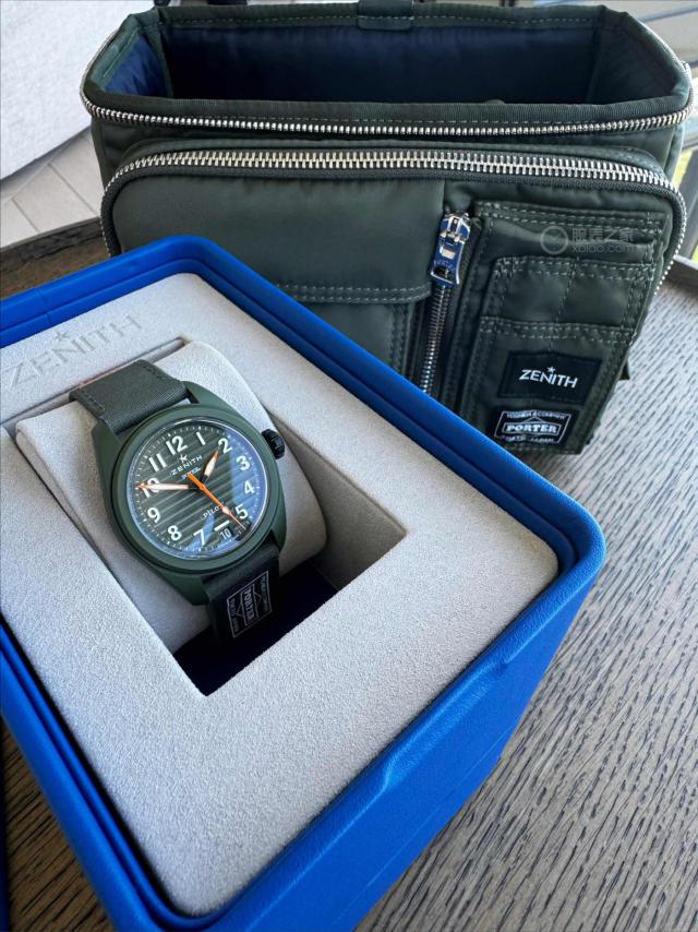 当然,联名必须是因为合作理念相同,真力时拿出自己著名的飞行员系列,porter 在日本乃至国际上也很有名。两家公司以旅游为主题,创作出来的作品匹配度相当高。乍一看,我以为都是来自一个。联名手表是橄榄绿色调的陶瓷表壳,这就是 Porter 一种经典的包包颜色。