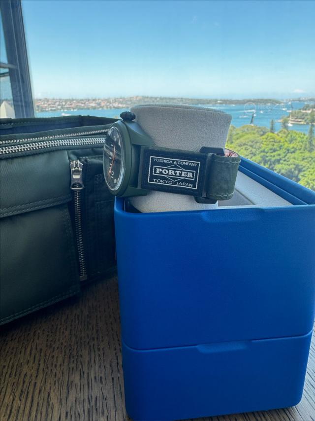 Porter 专门为这款联名邮差包设计,还可以存放手表的表盒,看到表主分享的图片,蓝色表盒和 porter 手提袋的内衬蓝也是呼应上的,这个小细节,拿捏。表主还说,他买表是看中了这款表。 porter 包包,但是我相信如果不是这个时候的真力。 porter 联名,他一时半会儿不会去买邮差包吧?因此,联名的意义就是双赢!