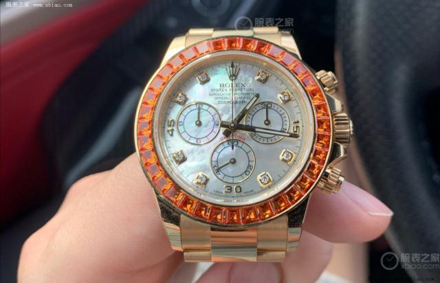最后要介绍的“隐藏款”,来自劳力士宇宙计型迪通拿。这种罕见的手表型号 使用116578SACO 黄金表壳18K,贝母表面与橙蓝宝石表圈相结合。论坛表主 @APEX 此前曾晒过这块表,据报道该表于此。 2019 由于晶石工艺产量的限制,2008年制造十分稀缺,目前二级市场定价从 280,000 至 400,000 美元不等,奢华水平比“彩虹迪”更好。(图 / 文 腕表之家 萧峰)