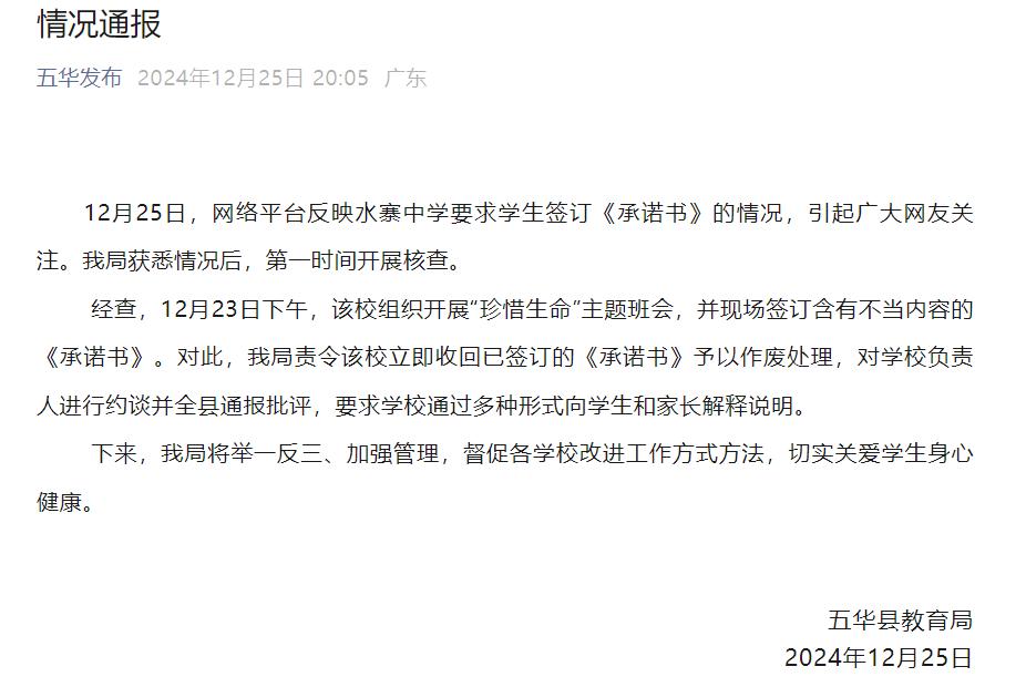 12月25日,网络平台反映了水寨中学要求学生签署《承诺书》的情况,引起了众多网友的关注。得知情况后,我局立即进行了审查。