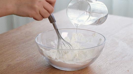 将面粉倒入大碗中,继续慢慢加入少量清水。