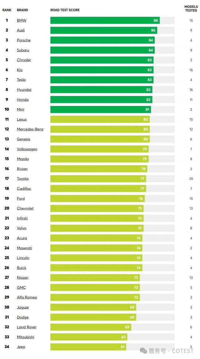 为根据路测平均分数对各品牌进行排名,我们考虑 CR 目前测试过的每个品牌的车型。顶级品牌在各种测试中往往表现出色,所有车型都一致表现出色。中游品牌的各种车在测试中表现参差不齐, / 或者测试结果平平。与竞争者相比,排名靠后的品牌显然处于劣势。