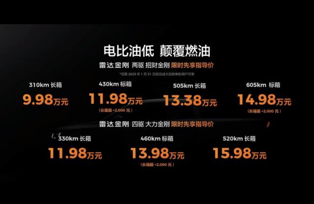 动力上,雷达金刚为消费者提供了两轮驱动和四轮驱动版本。两轮驱动版本最大功率 峰值扭矩,180kW 纯电续航309Nm, 430 公里;四驱版最大功率 峰值扭矩,280kW 纯电续航485Nm, 460 另外,四驱版零百加速成绩可达公里, 5.7 秒。