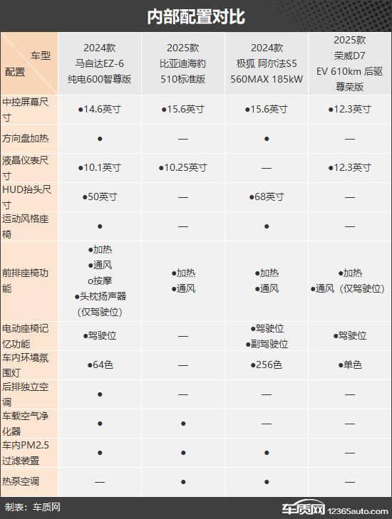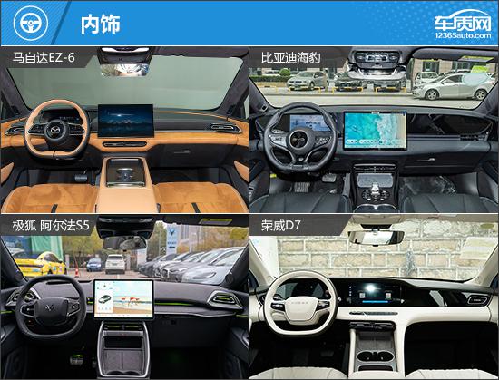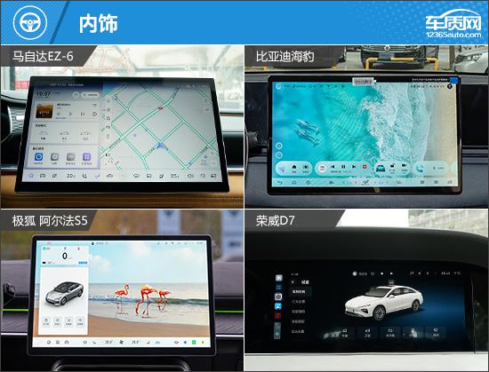 四款车的内饰设计风格各不相同,其中,极狐阿尔法无疑是最具运动感的。 S5,大规模的黑色辅以绿色装饰条,对年轻消费者非常有吸引力;荣威一定是最温暖的家。 上深下浅的经典配色组合D7的确让人找不到任何问题。马自达 EZ-6 与比亚迪海豹的设计元素相似,极简主义完全迎合了当前的主流趋势,强调营造奢华氛围。