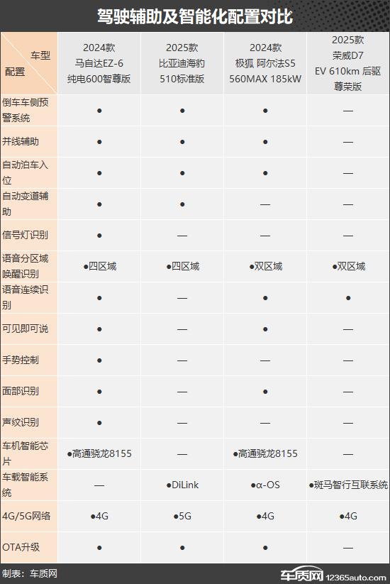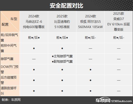 在驾驶辅助硬件配置方面,四款车的整体性能都很出色,基本达到了同级别的平均水平。智能设备部分,对比配置表,荣威 D7 还是有一些落后,整体表现最好的是马自达。 ZE-6。当然,这些配置对日常使用影响不大,大部分都是加分项。