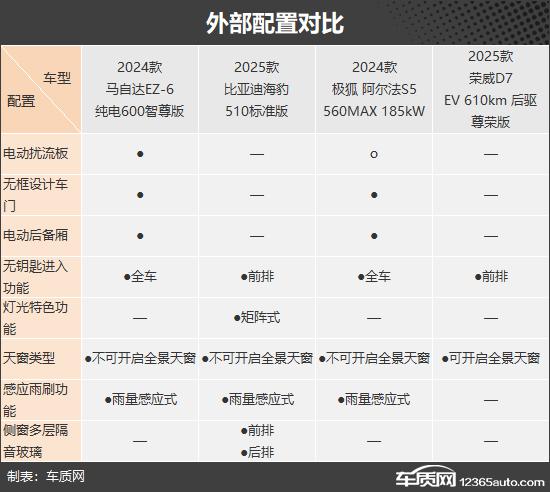 客观地说,四款车的基本设备都比较丰富,能满足日常使用的需要,差异主要表现在高级设备部分。遗憾的是,荣威 D7 继轴距被竞品“完爆”之后,在外观设备阶段也被迫沦为背景墙,唯一的亮点就是全景天窗支持开启。马自达 EZ-6 还有极狐阿尔法 S5 全部配备无框设计门、电动后备箱和全车无勺进入功能,不同之处在于,极狐阿尔法 S5 只有通过选择才能获得电动尾翼。独享比亚迪海豹矩阵大灯和前灯 / 后侧窗多层隔音玻璃,实用性能优异。