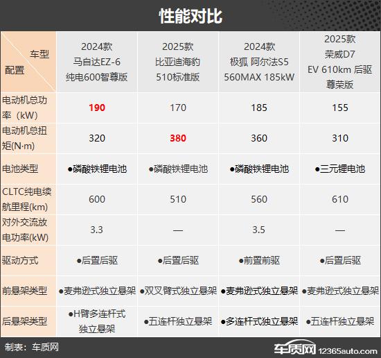 动力方面,除了极狐阿尔法,四款车都配备了单电机驱动系统。 S5 在前驱布局之外,其他车型都采用后驱的方式。电机参数差别不大。对于续航部分,荣威 D7 最后扳回一城。另外三款车型都是磷酸铁锂电池,只有三元锂电池搭配,CLTC 达到纯电续航里程 610km,能有效缓解里程焦虑。