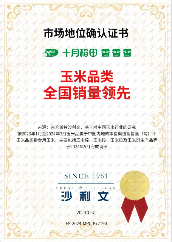 根据抖音平台的数据,截至今年, 11 月、十月稻田黄糯玉米单品链接累计销量已超过 1150 万单。据弗若斯特沙利文数据显示,截至 2024 年 5 月,十月份全国范围内稻田玉米品类销量领先。