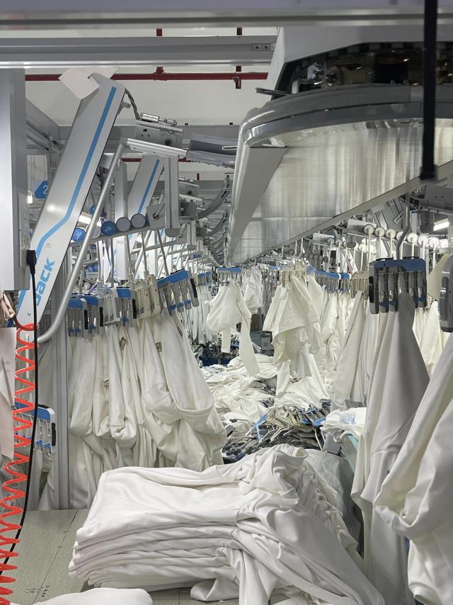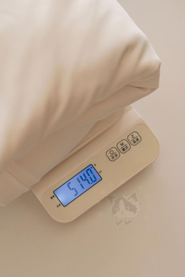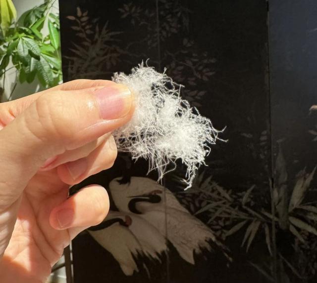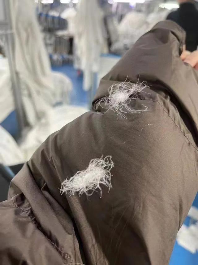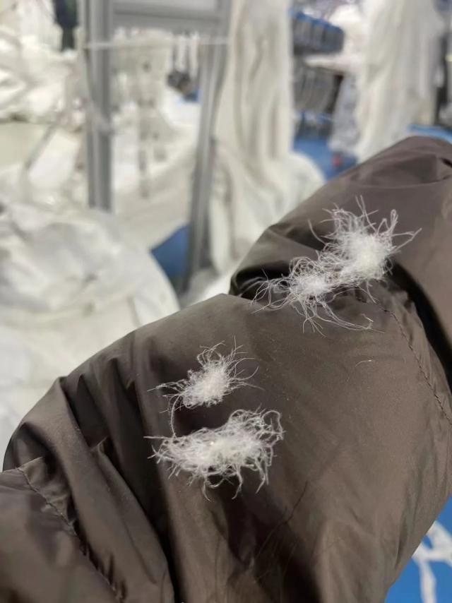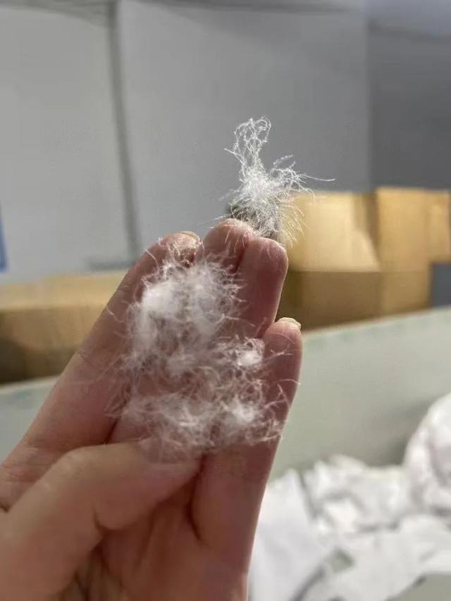 这是我在工厂随机抽取的一个。毕竟今年羽绒真假事件很大,我不怕检验。我也希望有人拿我的鹅绒去检测。真金不怕火。哈哈。就是这么自信。
