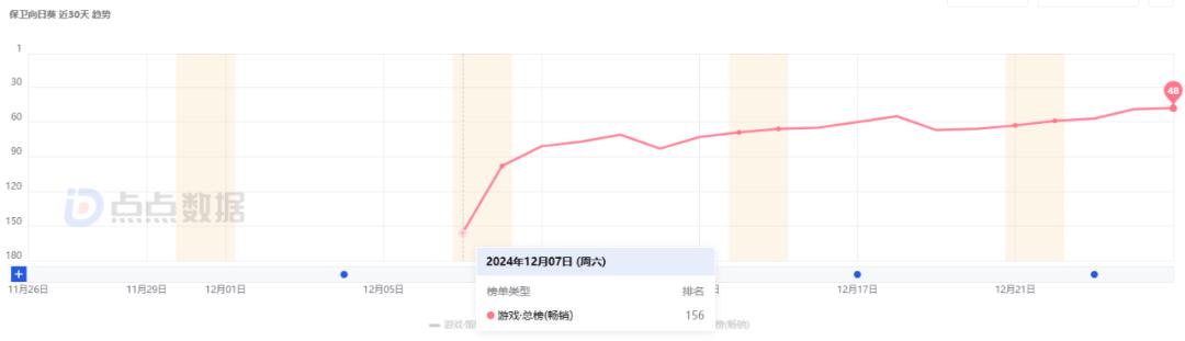 点点数据显示,手机游戏《保卫向日葵》于12月7日首次进入iOS畅销榜,排名第156位。随后呈现出稳定的增长趋势,12月25日冲进iOS畅销榜TOP50。