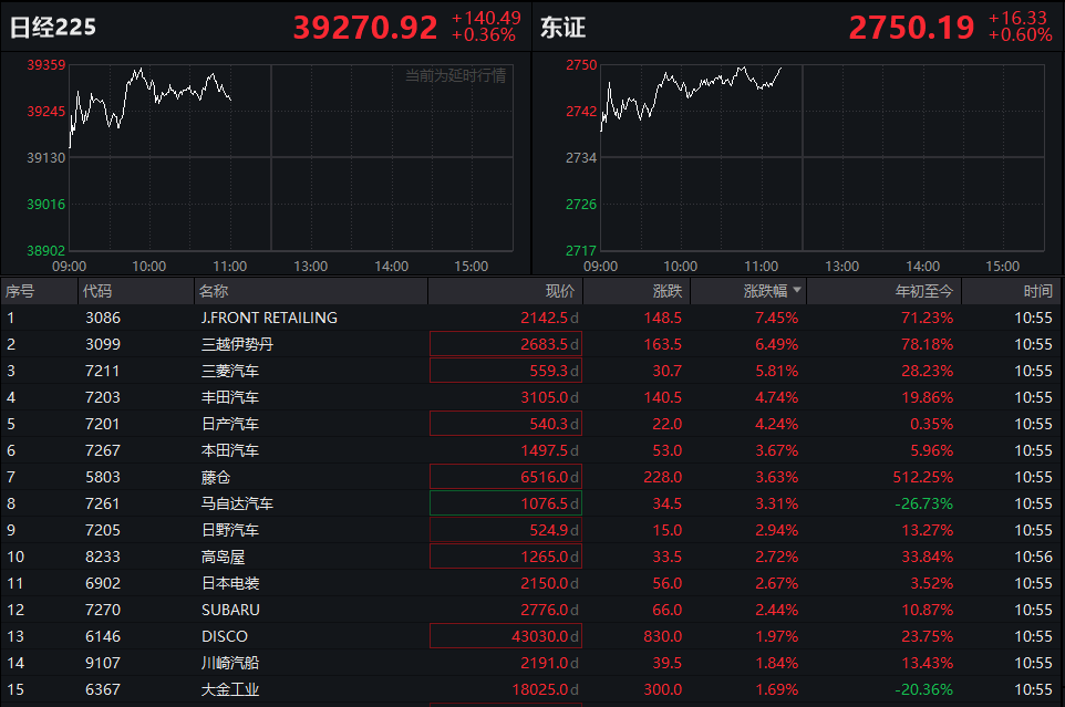 当天,日本股市整体表现强劲,截至发稿时,日经225指数上涨0.36%,东证指数上涨0.60%。