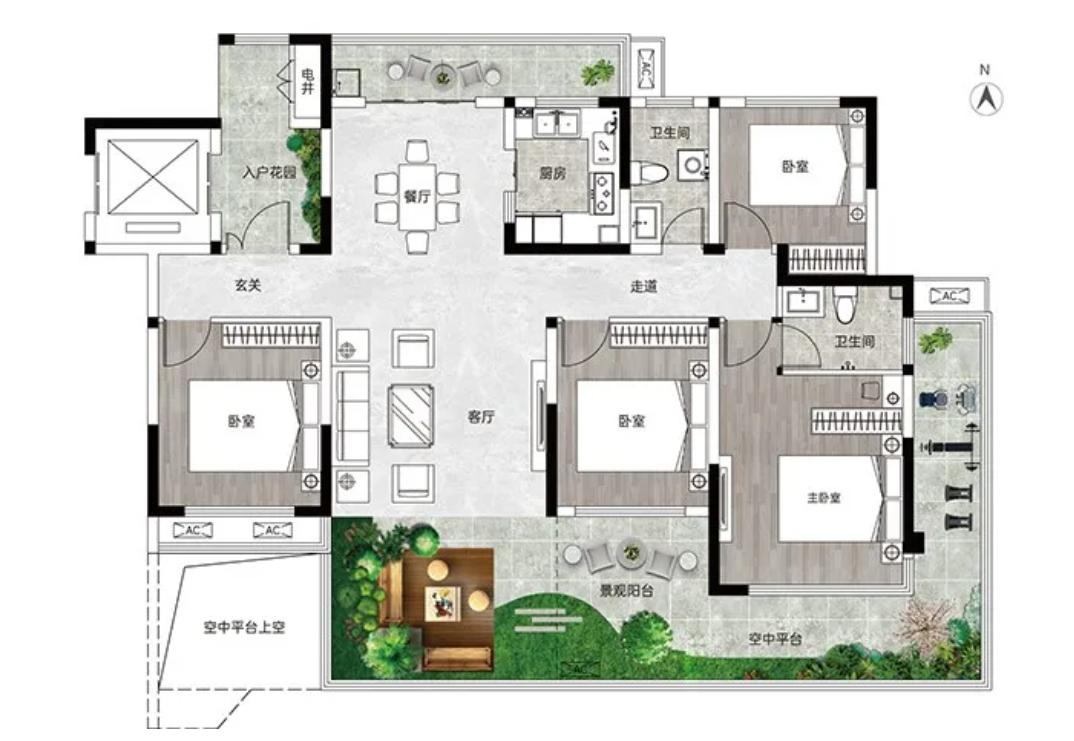 四代房屋设计,核心是通过打造超大型外挑露台,形成立体空中花园,从而丰富室内生活场景和生活体验。