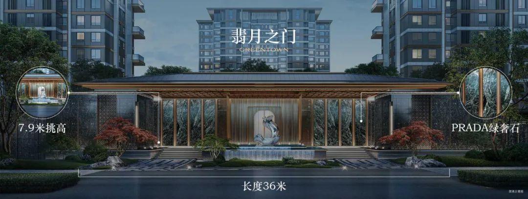 桂月云翠这个项目做了一个12,000㎡全维实景示范区一次性展示了“前庭三礼”和家庭线条的全貌。其中,翡月门高7.9米,长度达到 八十米,用八个PRADA绿奢石打造景墙,配以巨大的艺术雕塑,其规格完全可以不输五星级酒店。