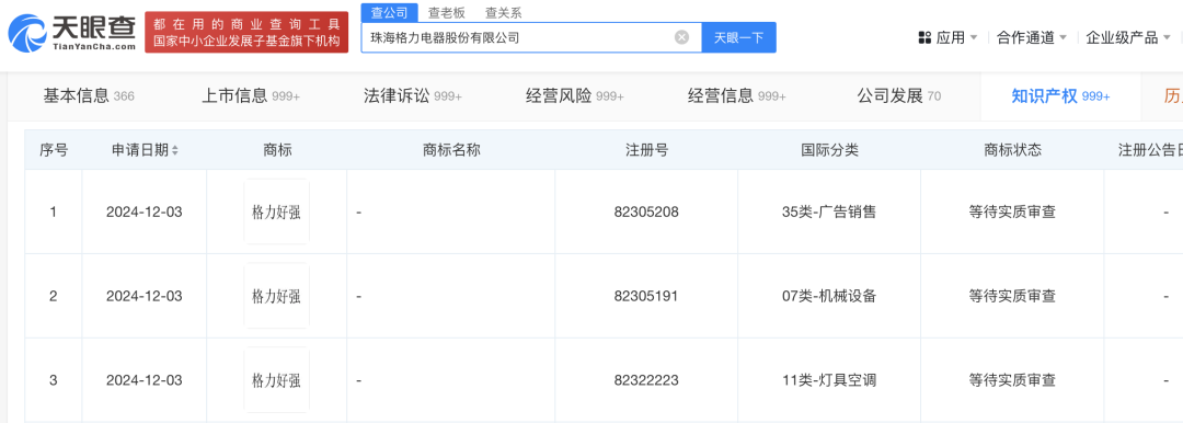 此外,天眼查知识产权信息显示,珠海格力电器有限公司近日申请注册多个“格力强”商标,涉及广告销售、机械设备、灯具空调等国际分类。目前的商标状态正在等待实质性的审查。
