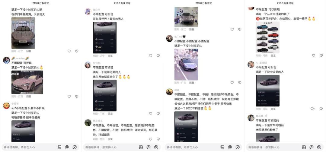 而且评论里几乎所有的车型都是小米SU7,网友直接发了小米SU7的配色截图。这种强烈的互动热潮不仅让黄子韬的粉丝更加紧密地团结在一起,也在一定程度上形成了新的网络媒体现象。